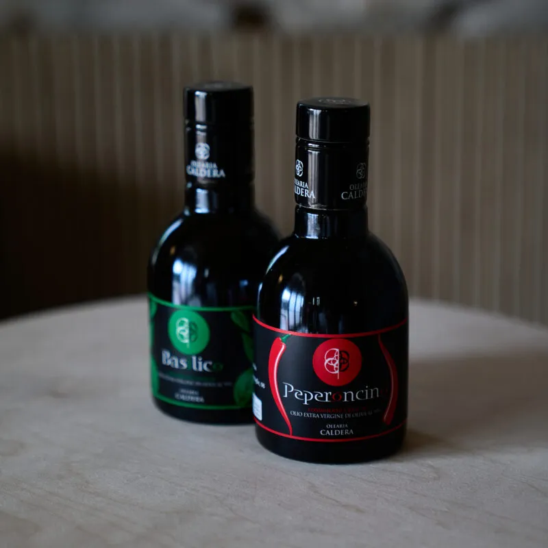 Condimenti esclusivi dell’Olearia Caldera, a base di olio EVO di qualità superiore insaporiti al basilico e peperoncino. Perfetti per esaltare ogni piatto con un tocco di freschezza, aroma e piccantezza. Un viaggio di sapori mediterranei, per veri intenditori.